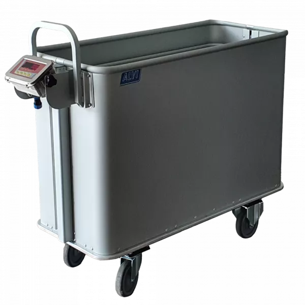 Medicimat vous présente le Chariot à fond remontant avec pesée électronique, une solution robuste et ergonomique pour le transport et la pesée de charges, conçu en alliage léger AlMg3 avec un système de pesée intégré.