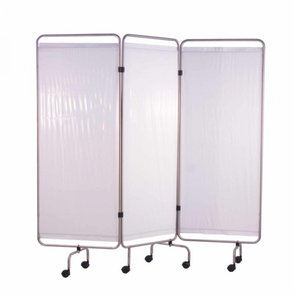 Medicimat vous présente le Paravent Inox Holtex, 3 Panneaux avec Rideaux Tendus Blancs, une solution idéale pour préserver l’intimité des patients tout en assurant une hygiène irréprochable grâce à ses rideaux lavables et son châssis inoxydable.