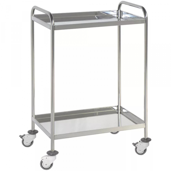 Medicimat vous présente le Chariot Auxiliaire à Deux Étagères. Idéal pour les environnements professionnels, ce chariot en acier inoxydable 18/10 est conçu pour offrir une excellente maniabilité et une grande robustesse. Avec ses deux étagères spacieuses et ses roulettes pivotantes, il facilite le transport de matériel en toute sécurité.