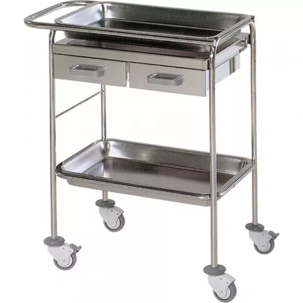 Medicimat vous présente le Chariot de soins deux Plateaux et deux tiroirs, un équipement médical en acier inoxydable 18/10 avec deux plateaux démontables et roulettes à pare-choc pour une maniabilité optimale.