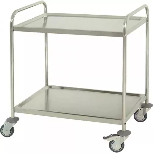 Medicimat vous présente le chariot multifonction, un équipement robuste en acier inoxydable conçu pour faciliter le transport de matériel grâce à ses deux étagères pratiques et ses roulettes maniables.