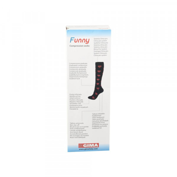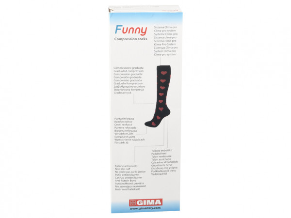 Medicimat vous présente les Chaussettes de contention FUNNY, des chaussettes mi-mollet à compression dégressive, conçues pour améliorer la circulation sanguine avec une touche de fantaisie ! Grâce à leur design ergonomique et leurs motifs multicolores, elles apportent confort, efficacité et style aussi bien au travail que dans la vie quotidienne. Disponibles en taille S-M et L-XL, elles sont livrées en boîte de 5 paires assorties.