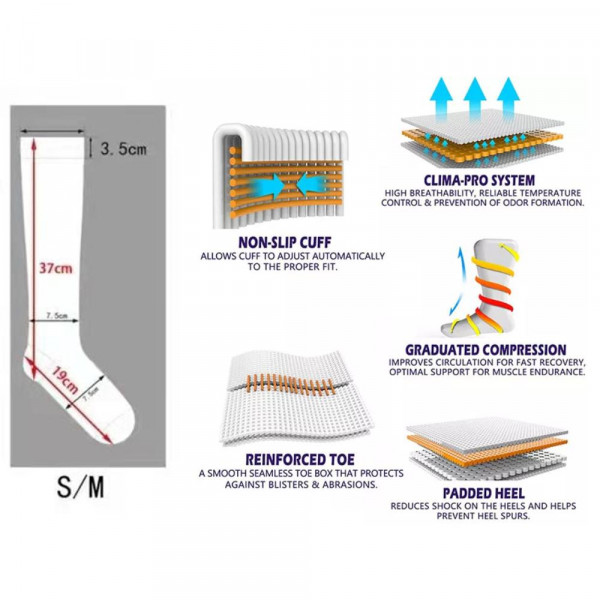 Conception technique : – Poignet antidérapant auto-ajustable – Pointe renforcée sans couture (anti-ampoule) – Talon rembourré (réduction des chocs & prévention de l’épine calcanéenne)