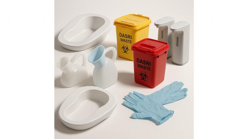 Les accessoires essentiels incluent les gants jetables, masques, blouses, solutions désinfectantes, bassins de lit médicaux, contenants hygiène médicale adaptés à la collecte des déchets et les distributeurs de savon ou gel. Ces équipements garantissent une barrière sanitaire efficace.