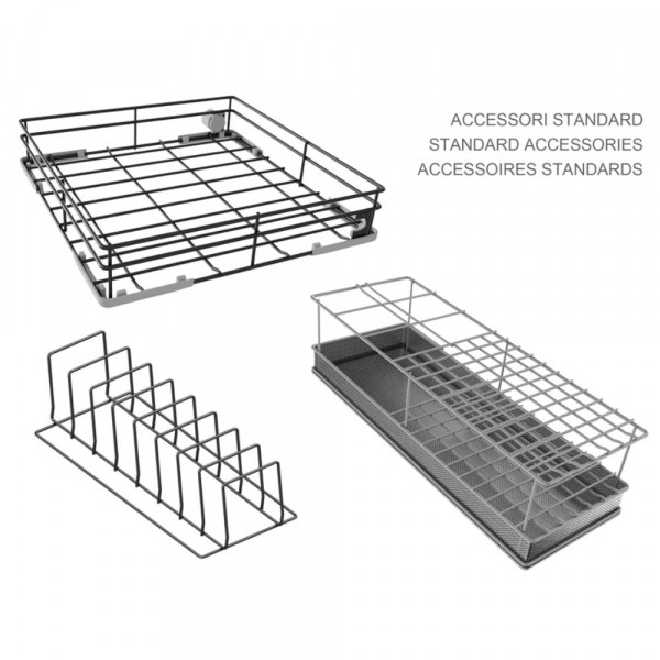 Accessoires inclus : Panier de lavage standard, compartiment pour instruments verticaux, compartiment pour 8 cassettes chirurgicales