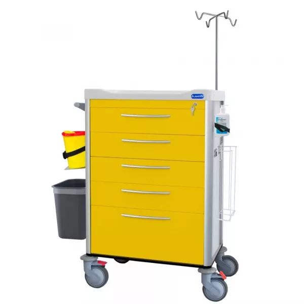 Medicimat vous présente le Chariot d'isolement Configuration IC01, conçu pour assurer un stockage sécurisé et efficace des fournitures médicales. Il est équipé de 5 tiroirs spacieux et d’accessoires essentiels pour l’hygiène hospitalière.