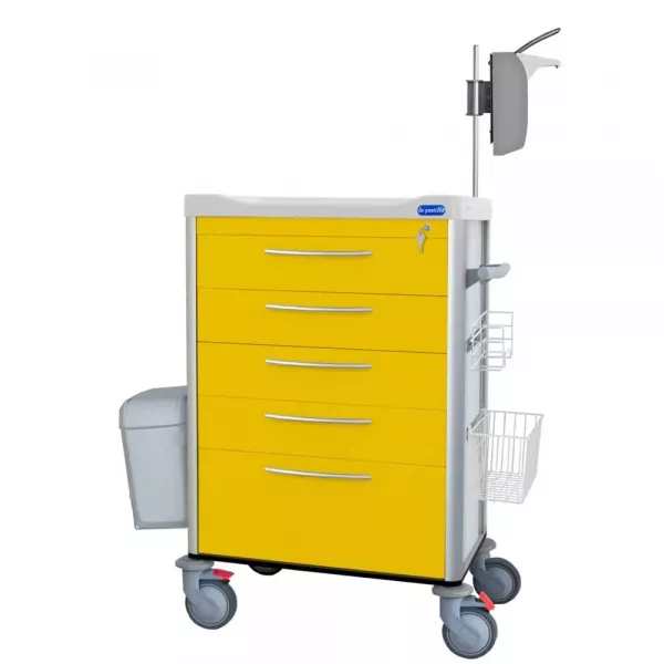 Medicimat vous présente le Chariot d'isolement configuration IC02, un modèle amélioré avec des accessoires supplémentaires pour une meilleure efficacité en milieu hospitalier. Il comprend 5 tiroirs spacieux et divers accessoires pratiques.