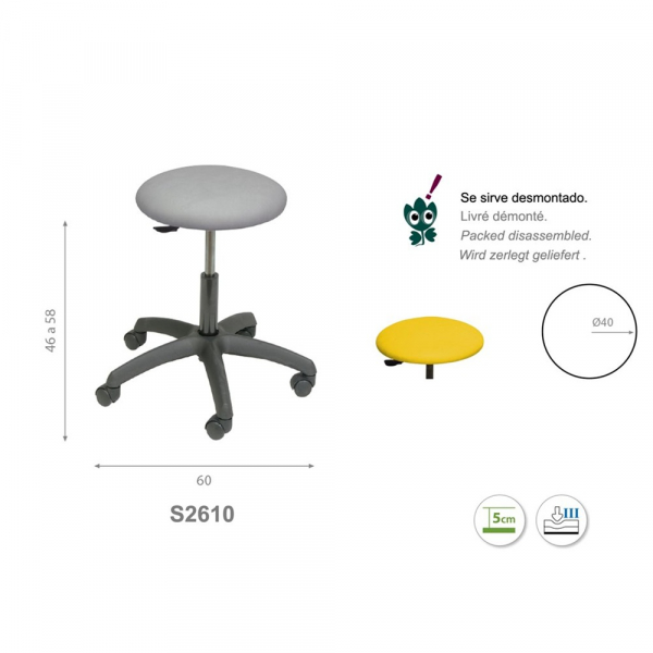 Medicimat vous présente le tabouret ergonomique Ecopostural. Conçu pour un confort optimal, ce tabouret pivotant dispose d'un réglage en hauteur par vérin à gaz et d'une assise circulaire en simili cuir ignifuge.