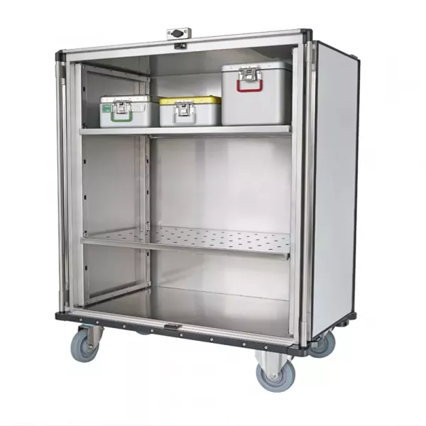 Medicimat vous présente le chariot armoire en acier inox avec 2 étagères réglables en hauteur, conçu en acier inoxydable AISI 304, entièrement soudé, robuste et étanche, idéal pour un usage professionnel.